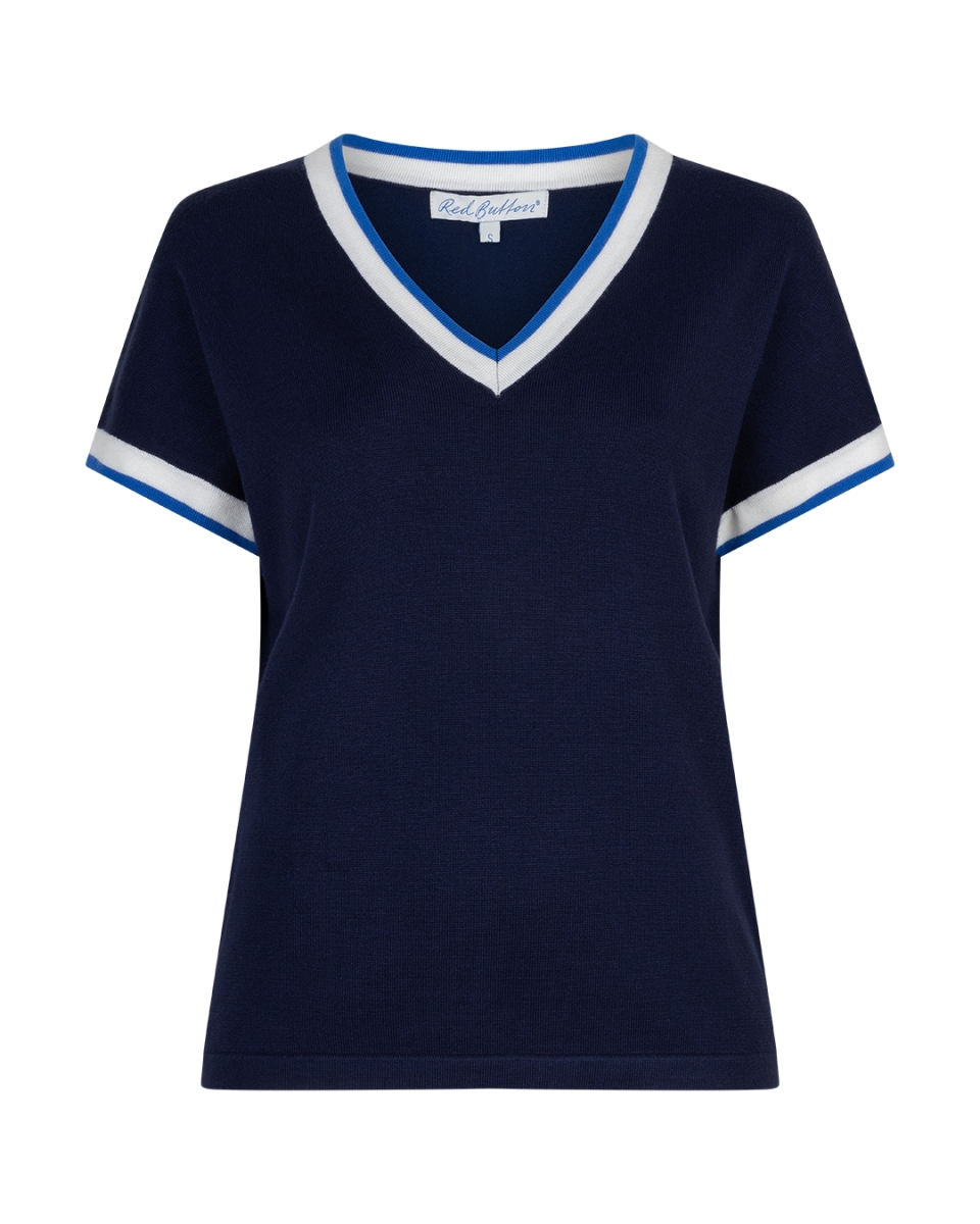 De Jerry V-neck Striped Rib is een gebreide top met korte mouwen. De top heeft een V-hals en een gestreepte boord bij de hals en aan het uiteinde van de mouwen. De Jerry V-neck Striped Rib heeft een regular fit en is verkrijgbaar in verschillende kleuren.